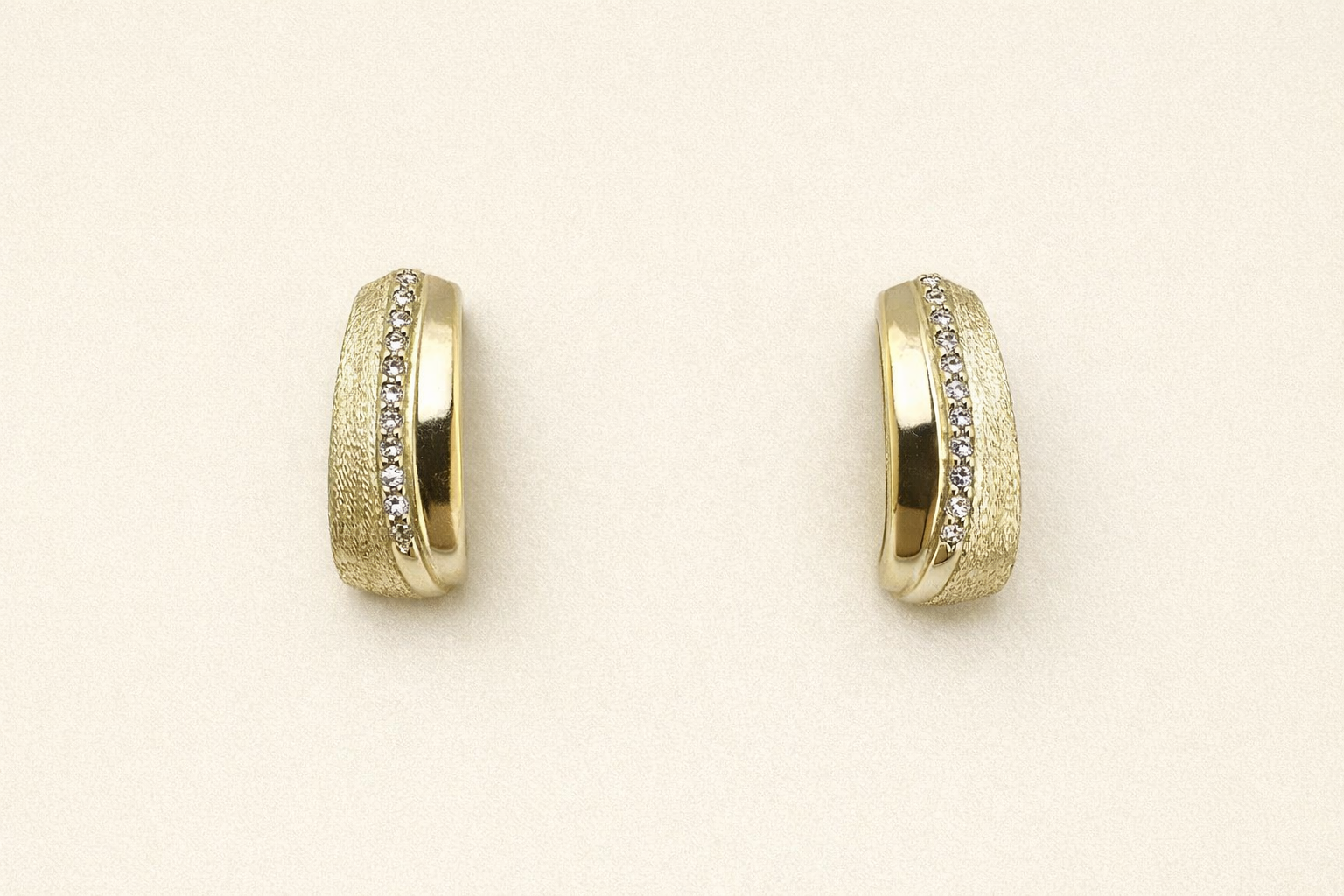 A sculptural form in balance of matte texture and smooth gold. A single fine line of pavé zirconia accentuates the curved silhouette and brings a soft, precise shine. A subtle, modern piece that is easy to wear, yet always gets noticed.